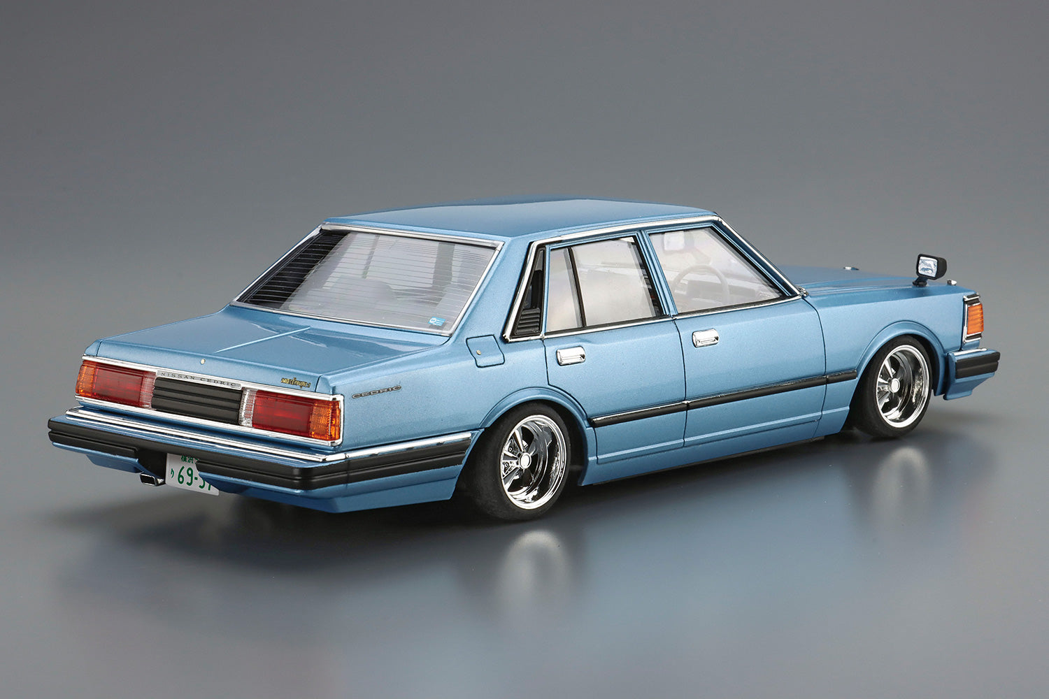 Build a true old-school sedan with this 1/24 scale Nissan 430 Cedric model kit from Aoshima’s High Class Custom series. Features include a new Brougham-style front bumper, selectable early or late tail light designs, adjustable ride height, and fender trim seals. The kit comes with 14-inch Krager wheels, ultra-thin tires, aluminum license plate, and is molded in white. A perfect choice for fans of classic Japanese VIP