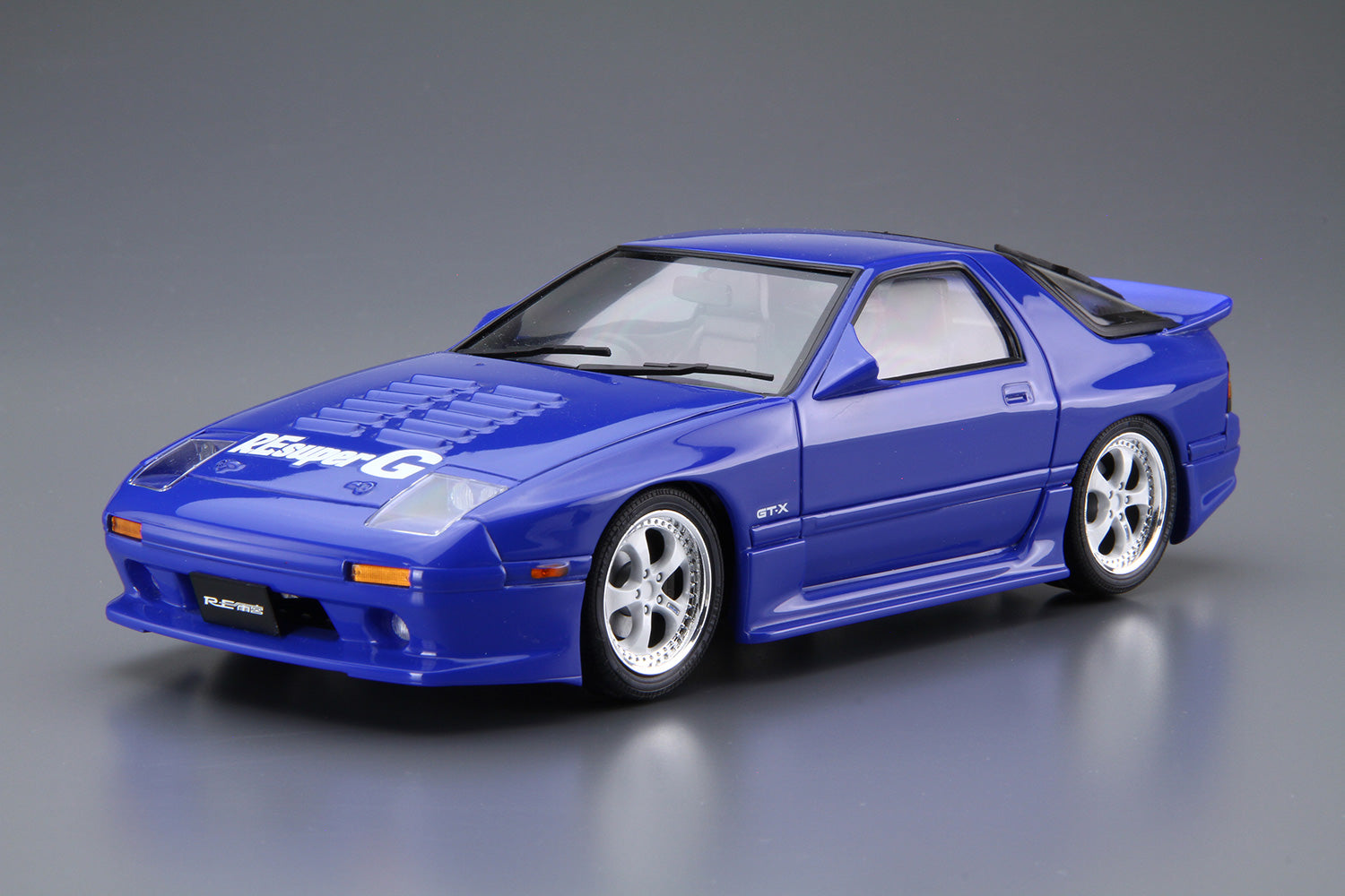 Recreate the 1989 Mazda FC3S RX-7 by RE Amemiya with this 1/24 scale model kit from Aoshima. This tuned car features the full cowl SPL body kit, side steps, two rear spoiler options, an aero bonnet, and super aero mirrors. The kit also includes a cannonball-type muffler and AW-7 wheels, capturing the aggressive style of this iconic rotary tuner.
