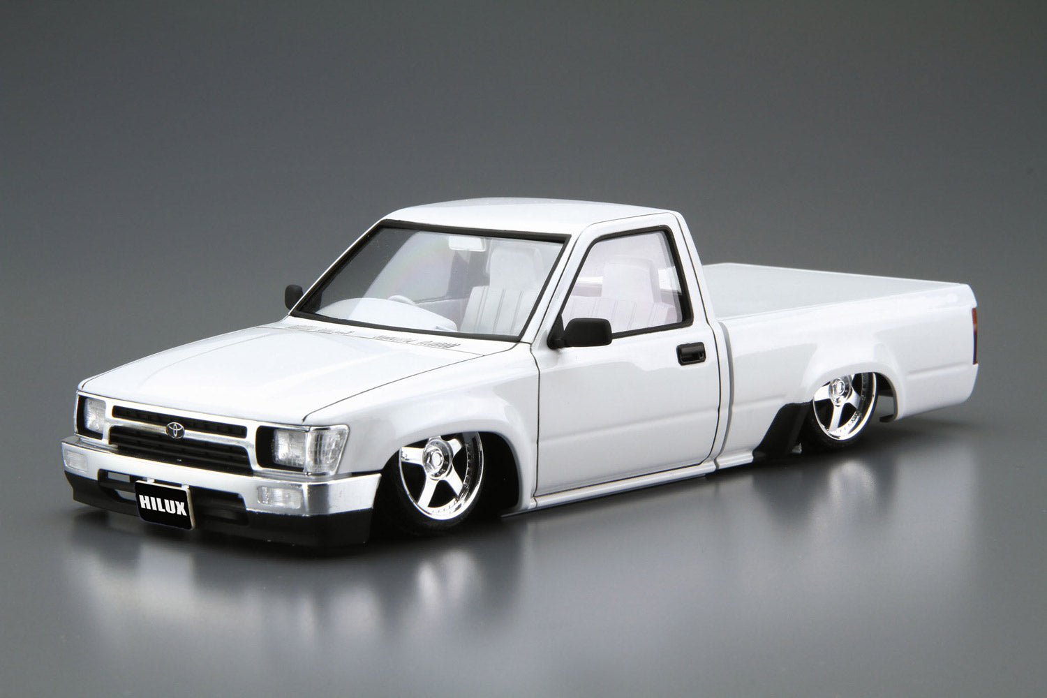 Recreate the slammed RN80 Toyota Hilux Custom from 1985 in 1/24 scale with this detailed Aoshima kit. Featuring a fully adjustable ride height via 4-wheel independent air suspension and functional dump gimmick, this build includes a wide range of custom parts, from bumpers and Euro tail lights to air tanks and compressor. Window frame stickers are also included, making it the perfect platform to build your own show-ready mini truck.