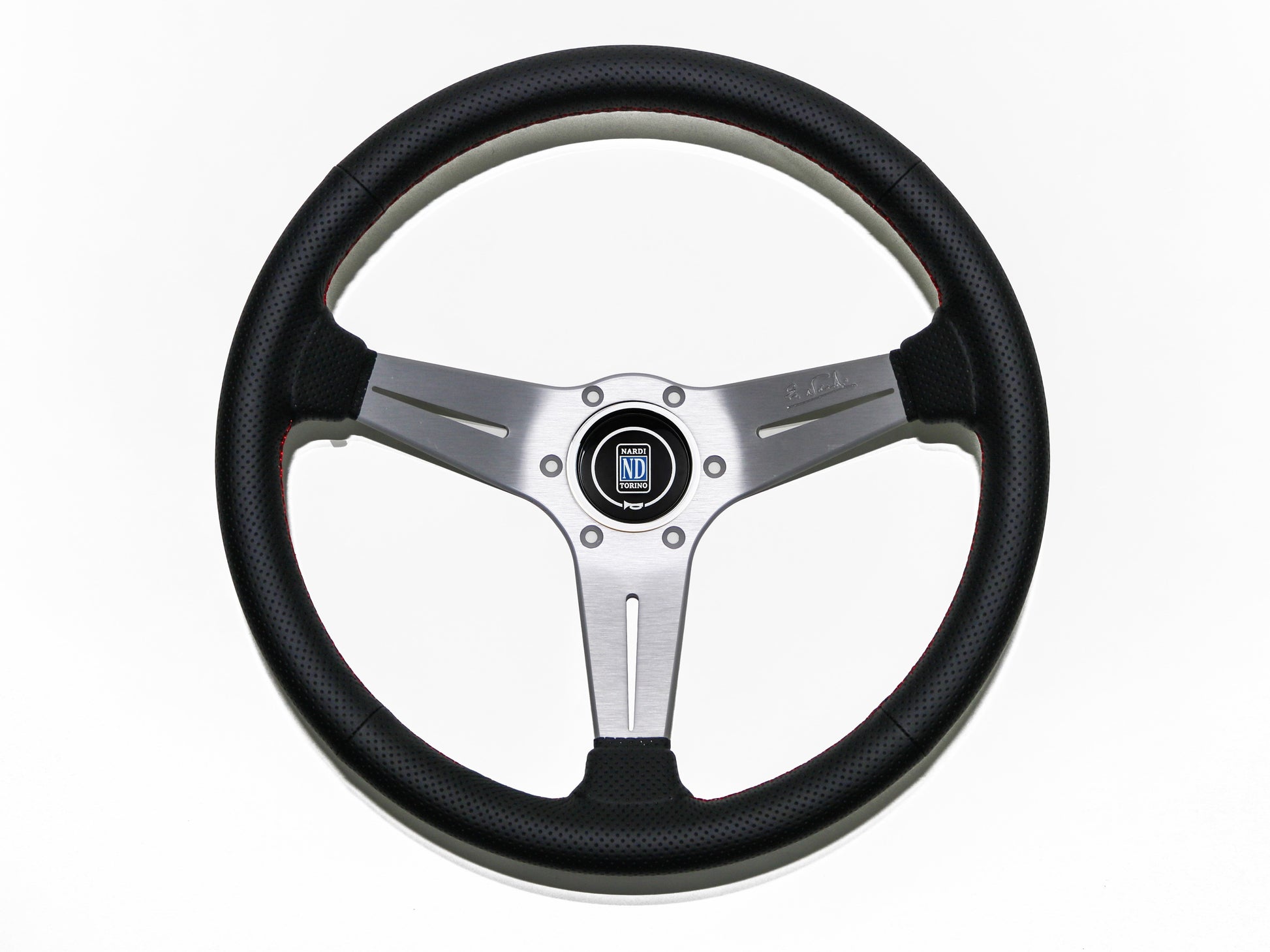 350mm Nardi Deep Corn - Black Perforated Leather / Silver Spokes / Red Stitching / 75mm Dish